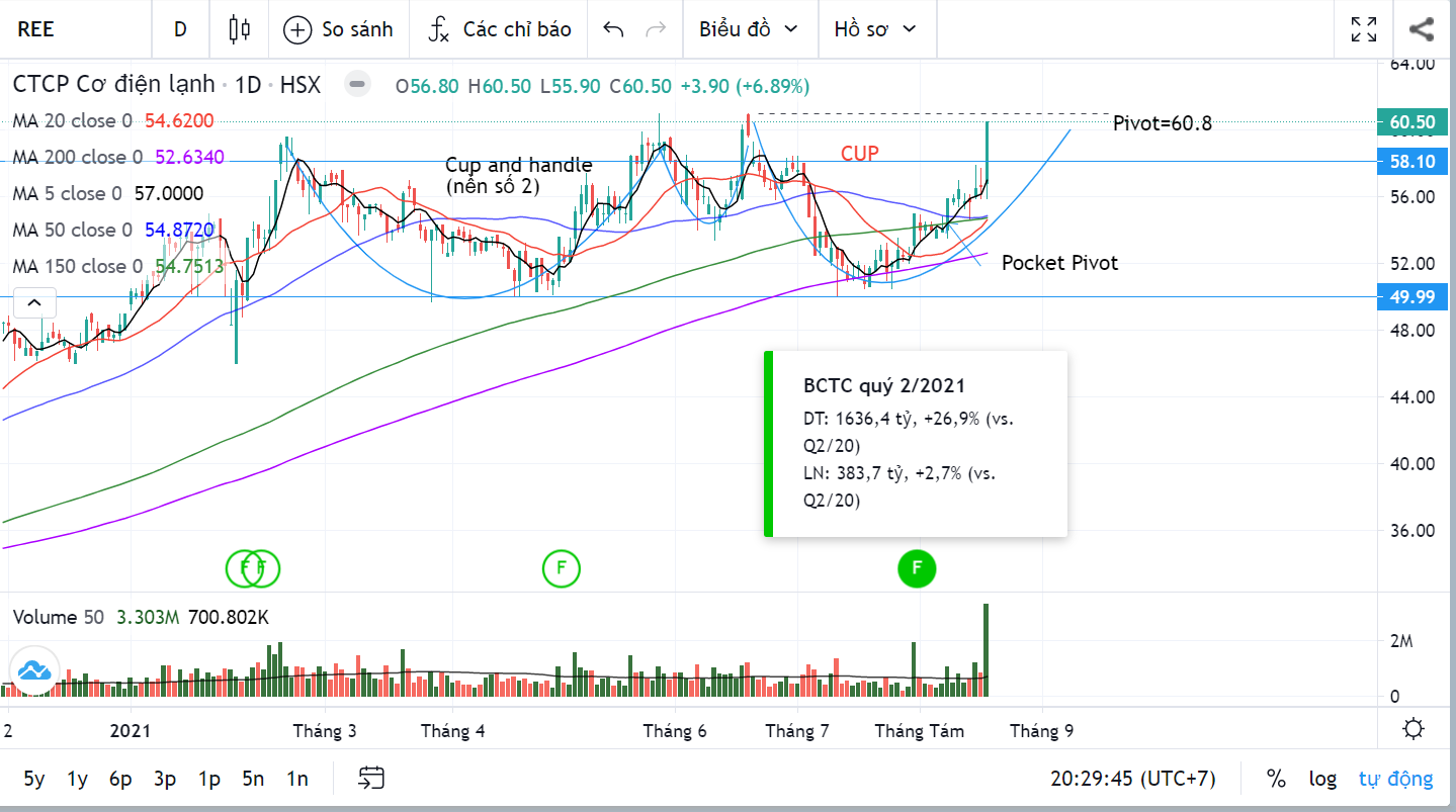 Đến phiên ngày 18/8/2021, REE tăng trần và tiến sát điểm pivot của mẫu hình CUP. Trader sẵn sàng mở thêm vị thế khi có điểm phá vỡ vượt qua điểm pivot. Vùng mua hợp lý là 5% từ điểm pivot theo nguyên tắc CANSLIM.