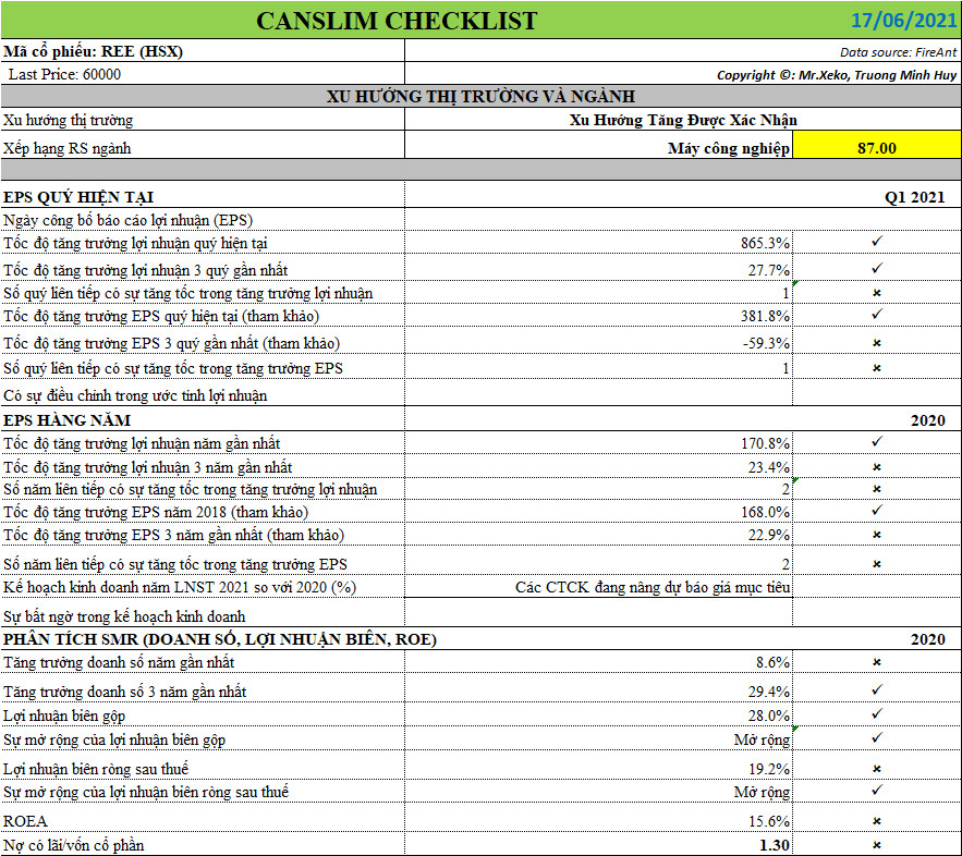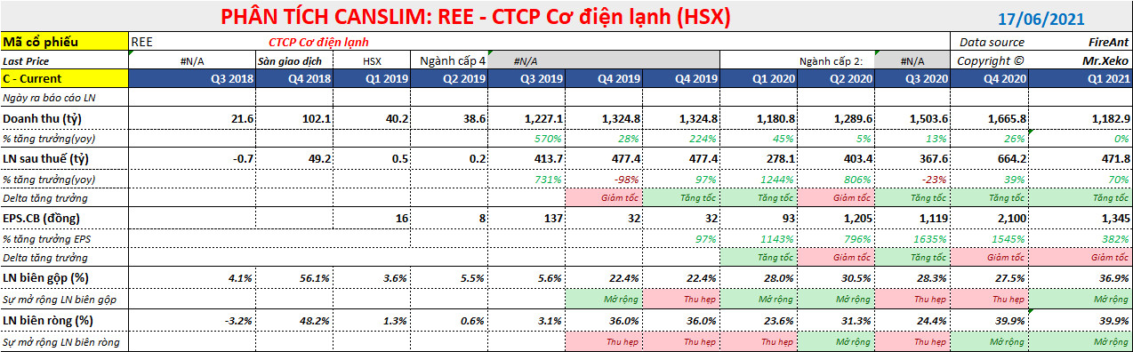 REE đáp ứng chữ C,I trong mô hình CANSLIM vì có Q4/2020 và Q1/2021 tăng trưởng EPS lần lượt là: 1596% và 865%. Trong giai đoạn hiện tại REE có chất xúc tác: