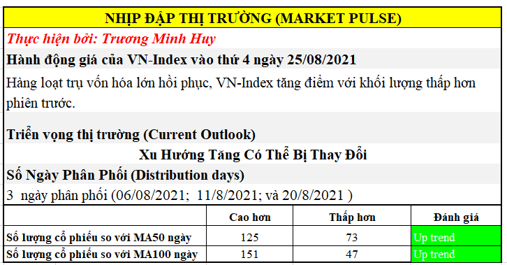 Chỉ số VN-Index tăng giá 0.83%, đóng cửa cao nhất phiên nhờ sự phục hồi của các mã cổ phiếu vốn hóa lớn như MSN, GAS, VCB, GVR, HPG…Tuy nhiên, thanh khoản còn thấp hơn so với phiên trước. Sự tăng giá phiên hôm nay xác nhận dấu hiệu No Suppy của ngày 24/08/2021. Phiên hôm nay số hàng của phiên bùng nổ 2 tỷ đôla về tài khoản nhưng thị trường không có dấu hiệu bị bán tháo. Độ rộng thị trường vẫn bị thu hẹp với 17 mã cổ phiếu vượt đỉnh 52 tuần, thấp hơn so với con số 20 ngày hôm qua.