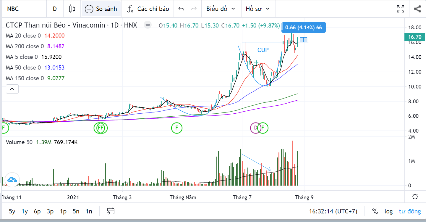 Sóng ngành than xuất hiện khi giá than gần đây tăng đột biến. NBC, CST đều đóng cửa trong sắc tím. NBC là cổ phiếu hàng đầu trong ngành than, với mức tăng trưởng lợi nhuận quý 2.2021 cao nhất ngành (110%). ROE và lợi nhuận gộp của NBC lần lượt là 56% và 21.5%, cao nhất tong ngành than. P/E của cổ phiếu này chỉ 2.71, thấp hơn so với trung bình ngành.