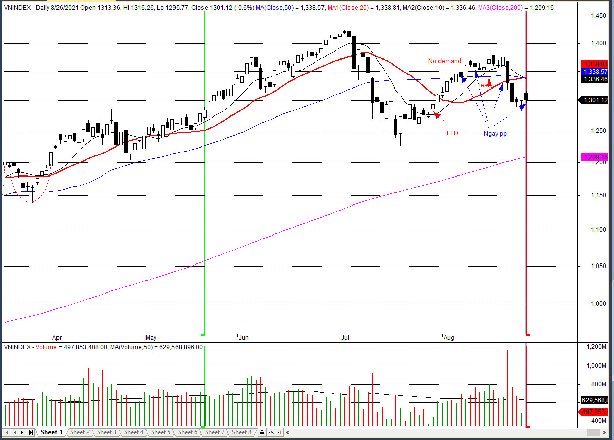 Một phiên giao dịch bùng nổ dành cho một vài nhóm ngành và cổ phiếu riêng lẻ. Thị trường vẫn đang chọn hướng đi khác cho riêng mình là điều mà chúng ta đang quan sát thấy. Chỉ số VN-Index giảm 0.6% với khối lượng giao dịch lớn hơn phiên hôm trước, đáp ứng tiêu chí phiên phân phối. Một phiên phân phối nữa lại xuất hiện và đem lại khá nhiều nỗi lo cho những nhà giao dịch theo trường phái CANSLIM. Tuy nhiên nhìn nhận lại trong quá khứ, việc các ngày phân phối xuất hiện không chứng minh rằng thị trường sẽ sụp đổ ngay sau đó. Ngày phân phối ý nghĩa của nó chính là ngày mà các nhà đầu tư tổ chức lợi dụng việc giá đang tăng để thoát hàng. Vì vậy thay vì quá tập trung vào việc phân tích thị trường, hãy tập trung danh sách cổ phiếu của bạn để lắng nghe hơi thở của từng cổ phiếu. Chính điều đó mới đem lại giá trị thực sự cho trader, hãy tập quan sát và theo dõi, nhiều cổ phiếu màu tím hoa sim sẽ tự động xuất hiện trong giỏ cổ phiếu của bạn.