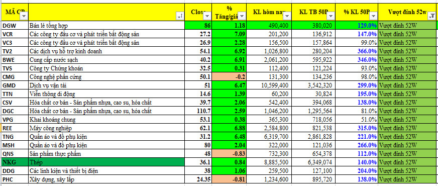 Đà tăng hôm nay tuy có sự suy giảm nhưng vẫn được ủng hộ bởi số lượng cổ phiếu nằm trên MA50 ngày khi con số này vẫn đang gần gấp đôi số lượng cổ phiếu nằm dưới MA50 ngày. Kết thúc phiên giao dịch ngày thứ năm, danh sách cổ phiếu vượt đỉnh 52 tuần tiếp tục bị rút ngắn còn 19 cổ phiếu. Đây chính là thị trường của từng cổ phiếu, dòng tiền phân hóa vào một số nhóm ngành cụ thể thay vì toàn thị trường, thời thế đã khác, uptrend nhưng không phải mua mã nào cũng sẽ chiến thắng như giai đoạn trước đây.