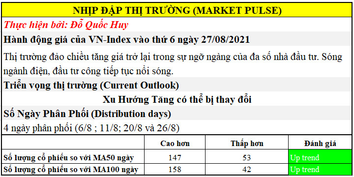 Chứng kiến nhiều thông tin tích cực về diễn biến vaccine của Việt Nam sẽ được cấp phép khẩn cấp và sẽ đưa vào tiêm trên diện rộng cho người dân trong thời gian tới, thị trường đảo chiều tăng giá trở lại trong sự ngỡ ngàng của nhóm nhà đầu tư đang “Cash is King”, nhiều cổ phiếu thuộc nhóm ngành ngân hàng đảo chiều hồi phục tăng giá trở lại tại những khu vực hỗ trợ quan trọng. Nhóm ngành bất động sản cũng tăng giá trở lại mạnh mẽ với những cái tên như NTL (+4.9%), HDG (+4.2%), CKG (+1.4%), DPG (+4.4%), DIG (+3.5%),… Chỉ số VN-Index hôm nay đóng cửa tăng 0.9% với khối lượng giao dịch lớn hơn phiên trước lấy lại hy vọng tăng giá tiếp tục cho thị trường chung. Điểm tích cực của phiên giao dịch hôm nay là dòng tiền đã quay trở lại ở một số nhóm ngành như đầu tư công, điện, dược, dệt may,…Chỉ số VN-Index sau khi kiểm tra thành công tại vùng giá của ngày FTD trước đó đã bật tăng trở lại mạnh mẽ đi kèm khối lượng lớn hơn KLGD BQ 50 phiên. Với 4 phiên phân phối, chúng ta vẫn đang ở trong một Uptrend chứ chưa phải là Dowtrend, đừng nên chốt lời quá sớm chỉ vì thị trường xuất hiện nhiều ngày phân phối, hãy tập trung vào danh mục cổ phiếu nắm giữ – đó mới chính là nơi mà trader nên trông coi một cách cẩn thận để tìm kiếm lợi nhuận.