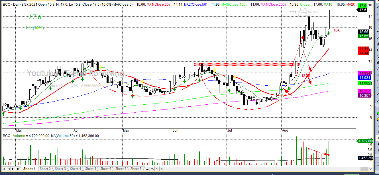 Cổ phiếu BCC là một trong những ví dụ minh họa sinh động nhất để chúng tôi có thể giải thích thế nào là hành vi bình thường của một cổ phiếu chiến thắng. Cổ phiếu BCC được chúng tôi mua và chốt lợi nhuận trong thời gian ngắn. Tuy nhiên, cần phải xem xét lại sau khi bán cổ phiếu này, đó chính là việc BCC đang thể hiện nó chính là chiến mã khi tiếp tục tăng giá sau khi có 8 ngày giảm giá với khối lượng thấp dần – đây chính là cú điều điều chỉnh tự nhiên của BCC. Cổ phiếu BCC tìm được ngưỡng hỗ trợ tại MA10 ngày và sau đó bật tăng với khối lượng lớn. Trader có thể giải ngân theo chiến lược Pull back MA10 ngày ở cổ phiếu này, hành động quả bóng Tennis chính là điều chúng tôi muốn nhắc đến trong trường hợp này. Bạn nên quan sát thấy cổ phiếu mà bạn đang nắm giữ sau khi breakout khỏi mẫu hình giá thể hiện những đặc điểm như BCC – đó chính là tính cách cũng như hành vi tốt của một cổ phiếu chiến thắng trong tương lai.