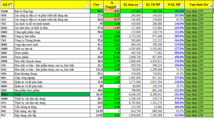 Đà tăng hôm nay tiếp tục được ủng hộ bởi số lượng cổ phiếu nằm trên MA50 ngày khi con số này vẫn đang gần gấp ba số lượng cổ phiếu nằm dưới MA50 ngày. Kết thúc phiên giao dịch cuối tuần, danh sách cổ phiếu vượt đỉnh 52 tuần đã có sự cải thiện khi tăng lên con số 26 cổ phiếu vượt đỉnh. Trong một tuần trở lại đây, chúng tôi quan sát thấy nhiều cổ phiếu thuộc nhóm ngành dược đã nhen nhóm vượt đỉnh 52 tuần, thông tin tích cực từ vaccine đã thu hút dòng tiền đầu cơ vào nhóm cổ phiếu này, nhóm ngành bảo hiểm cũng đang được nhiều nhà đầu tư chú ý tới.