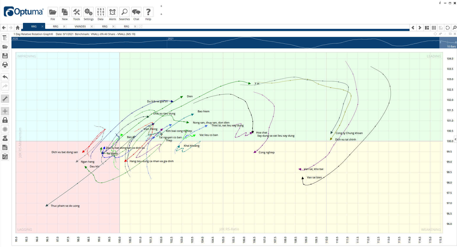 Bảng phân ngành ICB của Fireant. Dữ liệu ngày. Tính toán dựa trên phần mềm Optuma