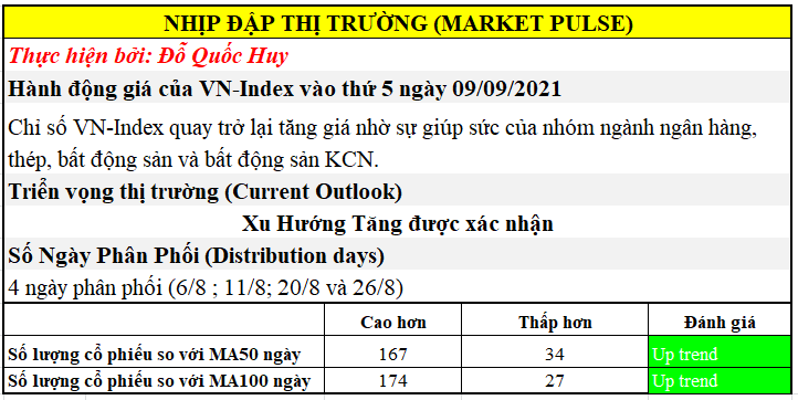 Đà tăng hôm nay tiếp tục được ủng hộ bởi số lượng cổ phiếu nằm trên MA50 ngày khi con số này vẫn đang gấp năm lần số lượng cổ phiếu nằm dưới MA50 ngày. Kết thúc phiên giao dịch ngày 9/9, danh sách cổ phiếu vượt đỉnh 52 tuần đã cho thấy sự cải thiện trở lại, 41 cổ phiếu vượt đỉnh là con số được cập nhật mới nhất của ngày hôm nay. Danh sách cổ phiếu vượt đỉnh vẫn tập trung ở các nhóm ngành phổ biến như bất động sản, hóa chất, điện, thiết bị xây dựng, xây lắp, khoáng sản. Sự xuất hiện của nhóm ngành chứng khoán, bản lẻ trong vài phiên trở lại đây đang góp phần đẩy đà tăng giá cho thị trường chung hiện tại.