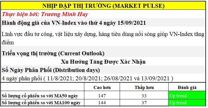 Chỉ số VN-Index ngày hôm nay xóa đi ngày phân phối 06.08.2021 khi thời gian 25 ngày giao dịch trôi qua. Như vậy, chỉ số VN-Index còn 4 ngày phân phối, trong đó có 3 ngày phân phối nhẹ với mức giảm dưới -1%. Trong 3 ngày tới, ngày phân phối 11.08.2021 cũng sẽ được xóa đi với lý do tương tự. Sự sụt giảm của các ngày phân phối giúp các nhà giao dịch có thêm sự tự tin khi mua theo điểm phá vỡ, vốn không hoạt động tốt trong hai tuần qua. Độ rộng thị trường đang ủng hộ xu hướng tăng với số lượng cổ phiếu nằm trên MA50 ngày chiếm áp đảo gấp 4.5 lần số lượng cổ phiếu nằm dưới MA50 ngày. Số lượng cổ phiếu vượt đỉnh 52 tuần phiên hôm nay là 39 mã, tăng nhẹ so với phiên hôm qua.
