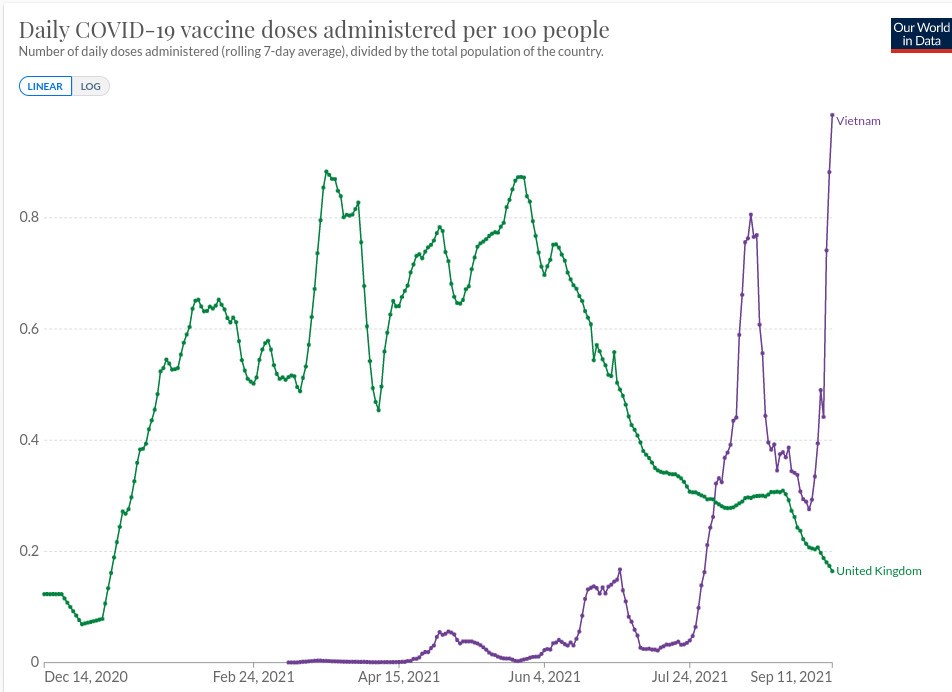Diễn biến tiêm chủng và các thông tin vắc xin của Việt Nam giai đoạn hiện tại khá tích cực. Ông Dominic Scriven, chủ tịch quỹ Dragon Capital hôm qua đăng dòng trạng thái trên twitter cá nhân cho rằng: “Vietnam now jabbing faster than the UK at the peak of their vaccine roll out. Now over 30mn jabs administered: (tam dịch: Việt Nam giờ đây có tốc độ tiêm phòng còn nhanh hơn cả UK (Anh Quốc) lúc ở đỉnh dịch. Việt nam đã tiêm 30 triệu mũi 1). Tốc độ tiêm vắc xin của Việt Nam được đẩy lên nhanh chóng trong thời gian gần đây nhằm mục tiêu sớm bao phủ vắc xin và chuẩn bị kế hoạch tái mở cửa nền kinh tế. Nếu như cách đây nửa tháng, tốc độ tiêm vắc xin chỉ tầm 300 nghìn mũi/ngày thì nay là hơn 1 triệu mũi/ngày. Bộ Y Tế cho biết, dự kiến việt Nam sẽ nhận 20 triệu liều vắc xin trong tháng 9 và để bảo đạm tiến độ, Việt Nam vẫn phải duy trì tốc độ tiêm 1 triệu mũi/ngày.