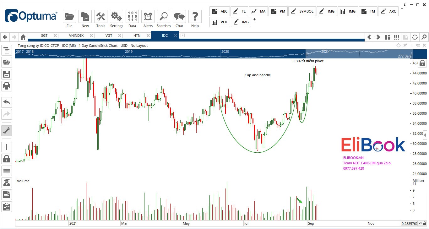 Cổ phiếu IDC đã tăng giá xấp xỉ 20% sau 3 tuần kể từ điểm mua breakout mẫu hình Cốc tay cầm. Chúng tôi đang suy nghĩ đến khả năng nắm giữ cổ phiếu này theo Quy tắc 8 tuần để tìm kiếm những khoản lợi nhuận lớn hơn. Cổ phiếu IDC tăng giá thành công sau vụ thay máu cổ đông, khi liên minh Gelex-SSG nắm quyền kiểm soát. (Xem thêm bài viết)