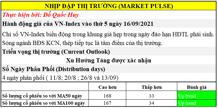 Đà tăng hôm nay tiếp tục được ủng hộ bởi số lượng cổ phiếu nằm trên MA50 ngày khi con số này vẫn đang gấp năm lần số lượng cổ phiếu nằm dưới MA50 ngày. Kết thúc phiên giao dịch ngày 16/9, danh sách cổ phiếu vượt đỉnh 52 tuần hiện đang tiếp tục cho thấy sự mở rộng, hiện tại có tổng cộng 44 cổ phiếu vượt đỉnh (cao hơn so với con số 39 của ngày hôm qua). Danh sách cổ phiếu vượt đỉnh hiện tại đã có nhiều sự thay đổi so với trước đây, nhóm cổ phiếu bất động sản chỉ còn duy nhất KDH xuất hiện trong danh sách vượt đỉnh, thay vào đó là nhóm ngành bán lẻ với các cổ phiếu nổi bật như MSN, MWG, FRT, DGW. Nhóm cổ phiếu vận tải, hóa chất, phân bón, sản phẩm dịch vụ, thép và đầu tư công đang là những nhóm ngành có số lượng cổ phiếu vượt đỉnh lớn nhất.