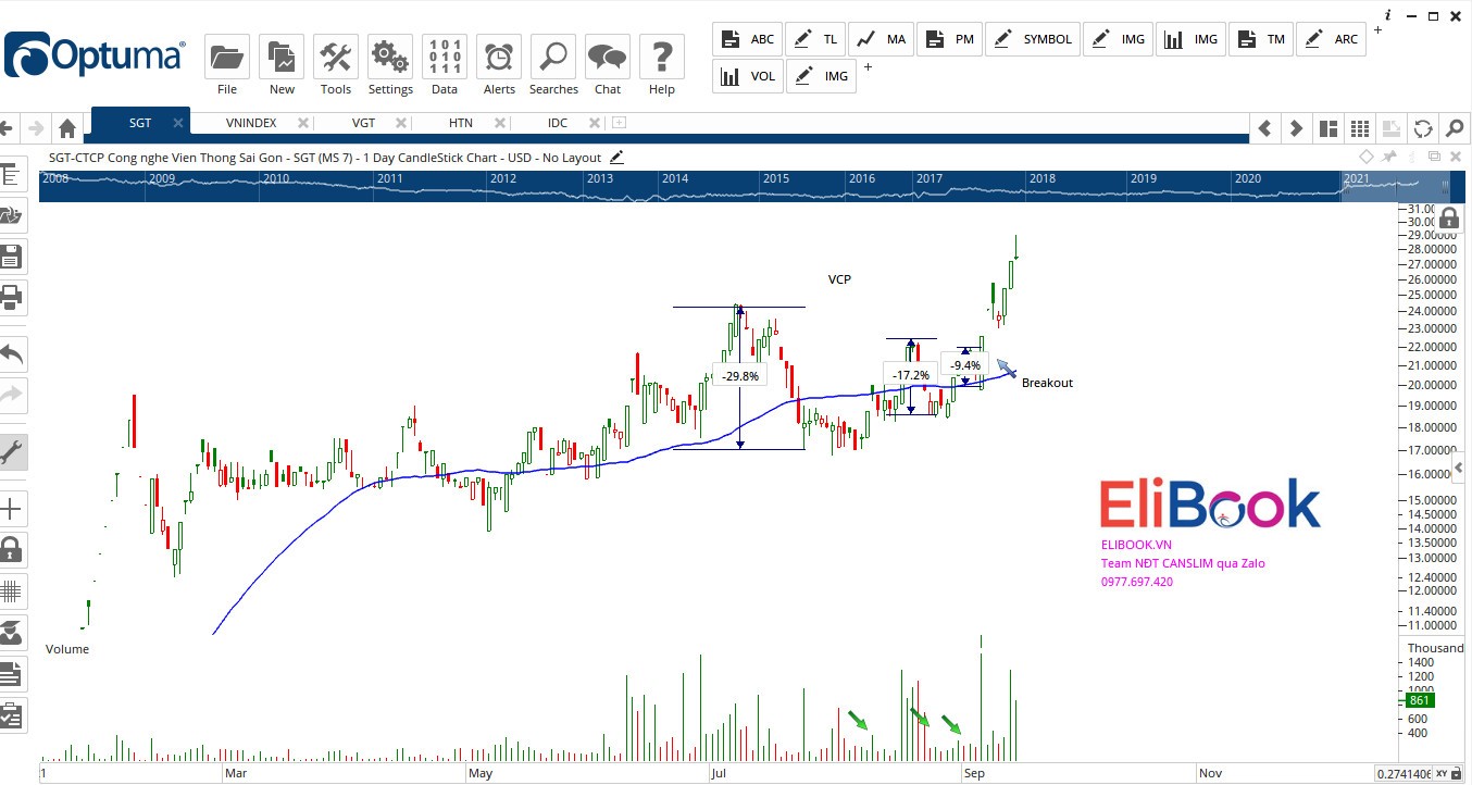 Cổ phiếu SGT tăng giá 22% kể từ điểm mua breakout mẫu hình VCP và được Team NĐT CANSLIM tiếp tục nắm giữ để tìm kiếm những khoản lợi nhuận lớn hơn.