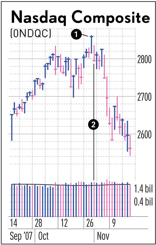 Thị trường đang ở trong một xu hướng tăng rất mạnh từ giữa tháng 8 cho đến cuối tháng 10. Hành đọng giá vào ngày 31 tháng 10 năm 2007 là mấu chốt; Chỉ số Nasdaq có một ngày tăng giá hoàn hảo 1.5%, đóng cửa gần đỉnh cao nhất ngày với khối lượng tăng (điểm đánh dấu số 1). Nó thieetst lập một mức đỉnh theo giá đóng cửa cao nhất trong nhiều năm. Thậm chí Nhật Báo IBD xếp hạng hành động giá ngày hôm đó là mức A+ (tức cực kỳ vững chắc). Điều đó cho bạn một kỳ vọng rõ ràng về một “kỳ vọng” thị trường sẽ chắc chắn tăng giá cao hơn nữa.