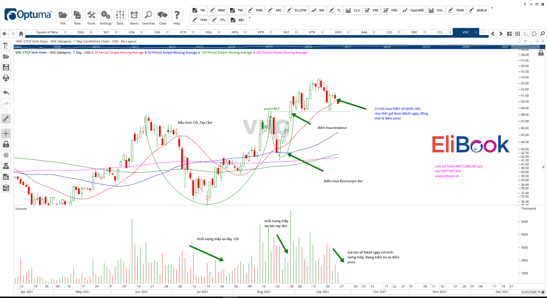 Trên đồ thị giá, VHC đang kéo về kiểm tra MA20 ngày với khối lượng thấp. Đây cũng chính là điểm pivot của mẫu hình Cốc, tại 48.5. Nếu như giá cổ phiếu giữ được MA20 ngày và bật tăng trở lại, đó là cơ hội để trader tiếp tục bổ sung vị thế ở mã cổ phiếu này vì điểm pivot hoặc MA20 trở thành khu vực kiểm tra cho thấy không còn nguồn cung khi được giữ thành công.