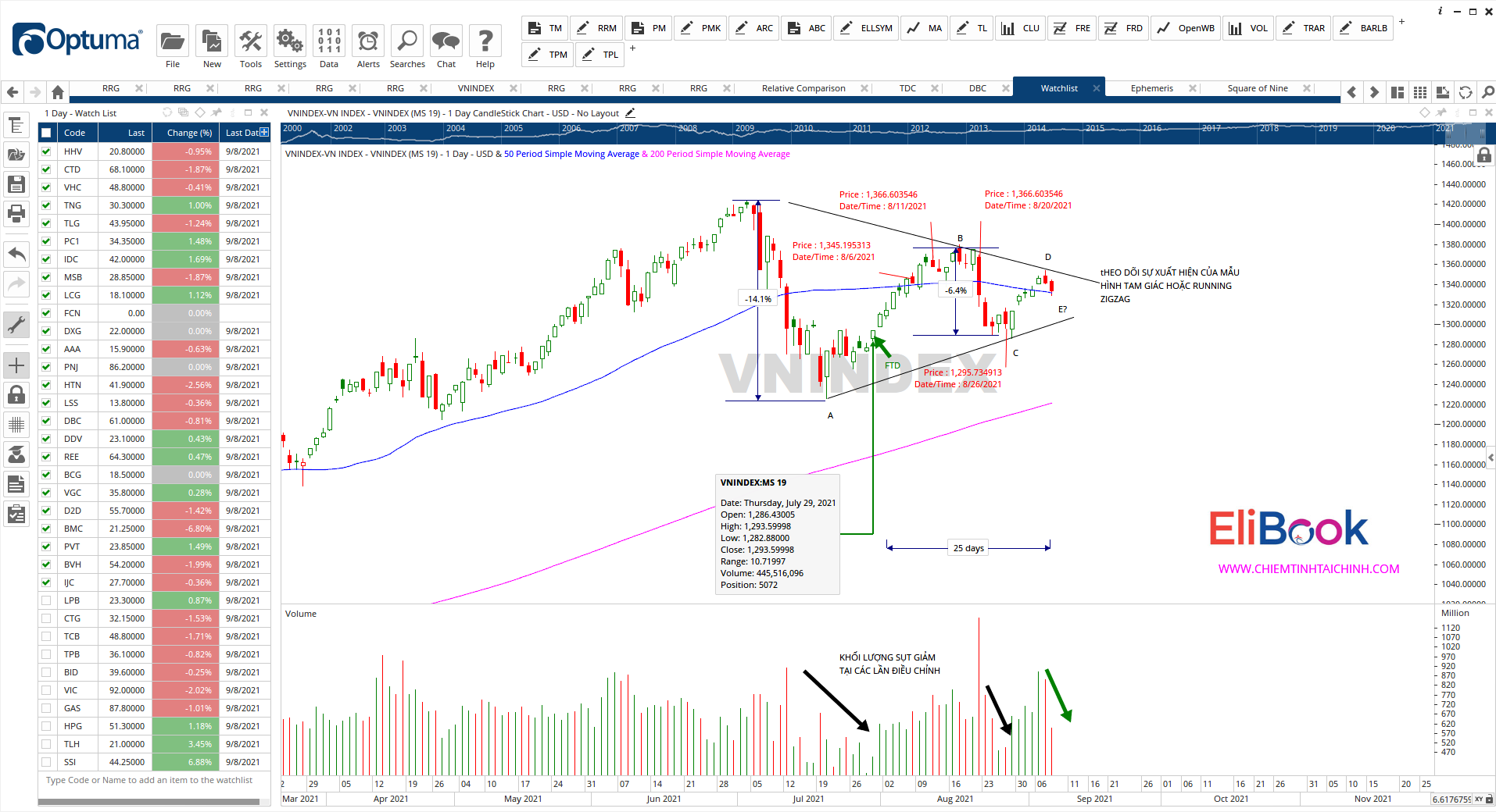Vấn đề hiện nay là chỉ số VN-Index đang nằm tại ngưỡng hỗ trợ quan trọng. Chỉ số VN-Index đóng cửa tại 1324.18 điểm và nằm dưới MA50 ngày khoảng 3 điểm. Đồng thời, chỉ số VN-Index cũng nằm ngay tại đường xu hướng bên dưới nối từ đáy ngày 20/7/2021 và 21/7/2021, là một phần của mẫu hình tam giác đang được theo dõi. Kết hợp với số ngày phân phối, chúng tôi chuyển triển vọng của VN-Index sang đèn vàng “XU HƯỚNG TĂNG CÓ THỂ BỊ THAY ĐỔI”. Điều đó có nghĩa trader cần nhanh chóng cắt lỗ, các khoản lãi nhỏ cũng nên được chốt để không bị biến thành khoản lỗ. Trader cũng hạn chế mua mới khi thị trường chung bật đèn vàng.