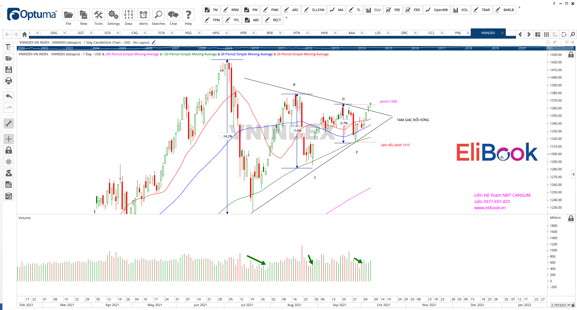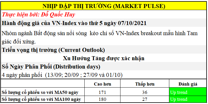Chỉ số VN-Index hôm nay bứt phá thành công ngưỡng kháng cự 1366 hình thành trong đầu tháng 9, chính thức breakout mẫu hình tam giác đối xứng. Chúng tôi chuyển trạng thái từ đèn vàng cảnh báo sang thành đèn xanh. Xu hướng thị trường trở lại với XU HƯỚNG TĂNG ĐƯỢC XÁC NHẬN cùng 4 ngày phân phối.