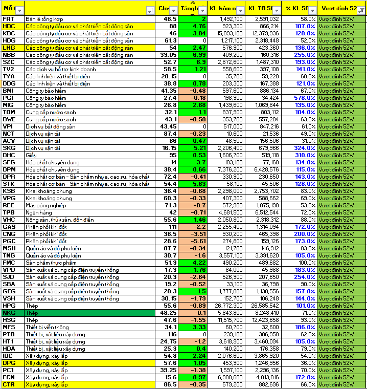 Danh sách cổ phiếu vượt đỉnh hiện tại lại tiếp tục có sự thay đổi. Sau thời gian tạm thời rút quân, nhóm cổ phiếu BĐS đã có nhiều gương mặt góp mặt trở lại trong danh sách vượt đỉnh. Nhóm cổ phiếu bảo hiểm, hàng tiêu dùng, điện nước, vận tải, hóa chất đang tiếp tục là những người dẫn đầu cho đầu tàu VN-Index.