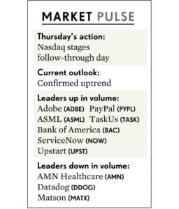 Khối lượng tăng trên sàn Nasdaq, khiến cho chỉ số này có ngày FTD (Bùng Nổ Theo Đà), nhưng giảm một chút ở trên sàn NYSE, so với khối lượng ngày thứ tư.