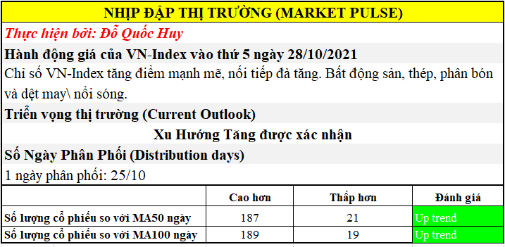 Số lượng cổ phiếu tăng giá gấp 2.1 lần số cổ phiếu giảm giá trên sàn HoSE. Số lượng cổ phiếu nằm trên MA50 ngày khi con số này vẫn đang gần gấp 9 lần số lượng cổ phiếu nằm dưới MA50 ngày (một con số kỷ lục từ trước đến giờ).