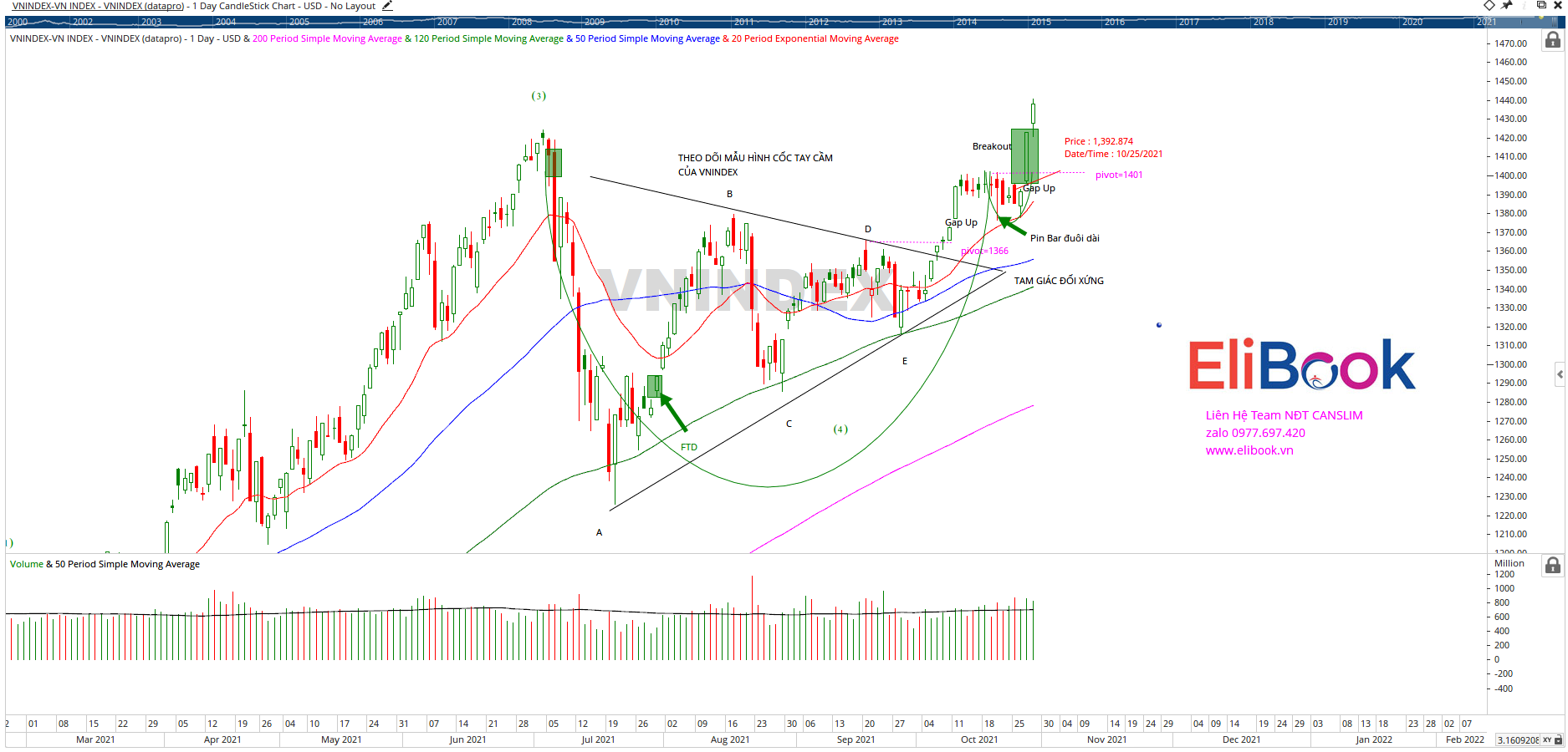 Chuỗi tăng giá nối đà 3 phiên liên tiếp là điều chúng ta nên nhìn thấy sau khi cổ phiếu breakout vượt ra khỏi vùng khung giá 1388-1401 trong hai tuần. Giá đóng cửa cuối phiên nằm ở đỉnh cao nhất ngày là biểu hiện của hành động giá bò tót.