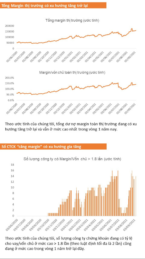 Lượng margin được nới trở lại sau một thời gian “bị căng” vì chạm trần hạn mức giúp thị trường có thêm lực đẩy. Trong thời gian qua, một số nhà đầu tư buộc phải bán cổ phiếu trong danh mục nếu như muốn mua mới thì nay đã được công ty chứng khoán cấp thêm hạn mức margin. Theo thống kê của VNDirect, lượng margin đang có xu hướng tăng trở lại trong tháng 10 và hiện đang ở quy mô 150% vốn hóa thị trường. Sắp tới, một số công ty chứng khoán sẽ hoàn tất việc nâng vốn điều lệ để có thể mở rộng khả năng cấp margin. Ví dụ, CTCK HSC sẽ tăng vốn điều lệ từ 3,050 tỷ lên 4,575 tỷ. Trong năm nay, SSI cũng nâng vốn điều lệ từ 6 nghìn tỷ lên 11 nghìn tỷ.