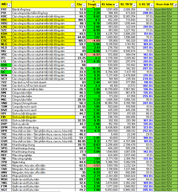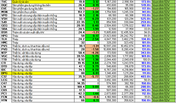 Danh sách cổ phiếu vượt đỉnh hiện tại vẫn tập trung ở nhóm cổ phiếu bất động sản, phân bón, bảo hiểm, năng lượng, thiết bị vật liệu xây dựng và đầu tư công. Các nhóm ngành may mặc, thực phẩm trong lĩnh vực hàng tiêu dùng đang có nhiều cổ phiếu nổi lên vượt đỉnh trong thời gian gần đây.