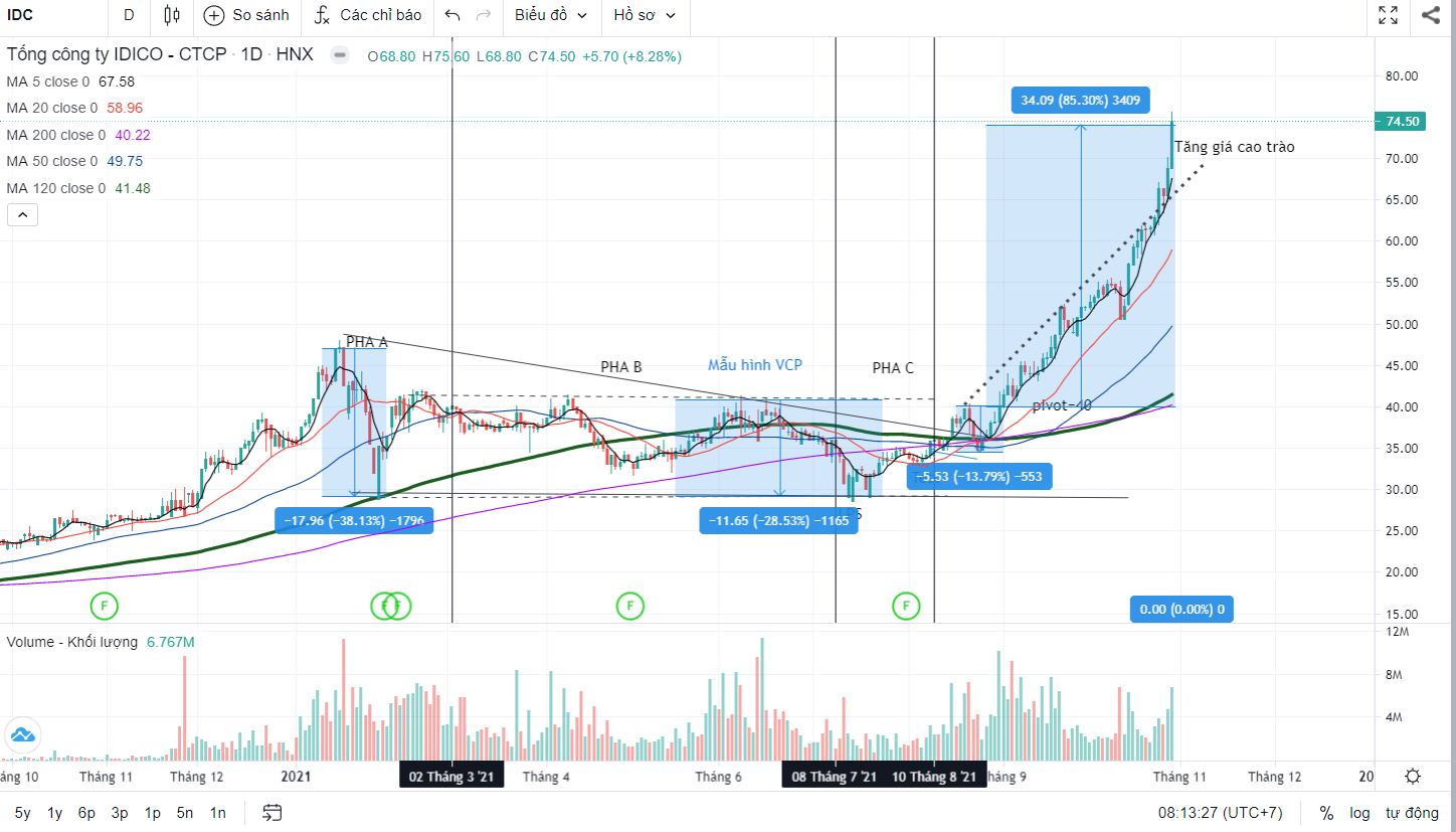 Cổ phiếu IDC đang có dấu hiệu chạy cao trào (Run Climax) và Team NĐT CANSLIM tiến hành chốt lãi ở mã cổ phiếu này, đem lại tỷ suất sinh lợi +80% kể từ điểm breakout mẫu hình VCP vào ngày 31.08.2021. Các biểu hiện tăng giá cao trào bao gồm giá cách xa gần 90% so với MA200 ngày, giá vượt đường xu hướng kháng cự bên trên, giá có spread rộng bất thường kể từ khi rời nền giá đi kèm với khối lượng lớn.