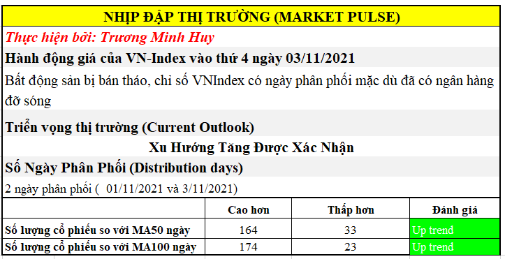 Như vậy, chỉ số VN-Index trong phiên hôm nay thêm 1 ngày phân phối đồng thời xóa đi 1 ngày phân phối. Số ngày phân phối vẫn là 2, thuộc mức thấp và do đó triển vọng thị trường vẫn là XU HƯỚNG TĂNG ĐƯỢC XÁC NHẬN. Số ngày phân phối thấp cho thấy dòng tiền thông minh chưa rời khỏi thị trường.