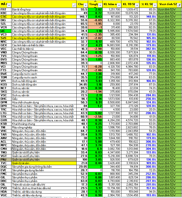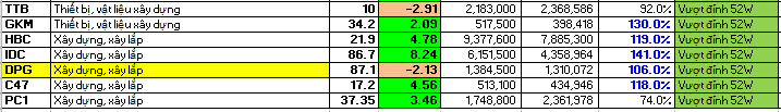 Kết phiên giao dịch, danh sách cổ phiếu vượt đỉnh 52 tuần vẫn duy trì ở mức cao. Có thêm 3 cổ phiếu tham gia vào danh sách này, nâng con số vượt đỉnh lên 60 cổ phiếu tất cả. Danh sách cổ phiếu vượt đỉnh hiện tại vẫn tập trung nhiều ở nhóm cổ phiếu bất động sản, chứng khoán, dệt may hóa chất, bảo hiểm, năng lượng, thiết bị vật liệu xây dựng và đầu tư công. Nhóm lương thực, thực phẩm nổi lên trong vài phiên gần đây.