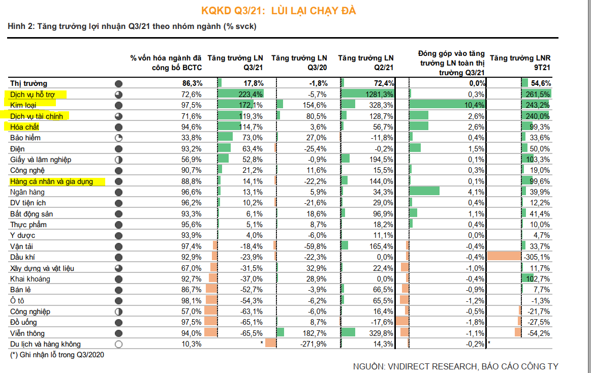 Theo báo cáo đến từ công ty chứng khoán VNDirect, các doanh nghiệp đang trở thành nhóm ngành hưởng lợi nhất nhờ sản lượng và giá bán bình quân đều tăng, mức tăng trưởng 17.2% so với cùng kỳ tính trong Q3/2021. Nhóm ngành dịch vụ tài chính (chủ yếu là các công ty chứng khoán), LN Q3/21 tăng 119.3% svck trong bối