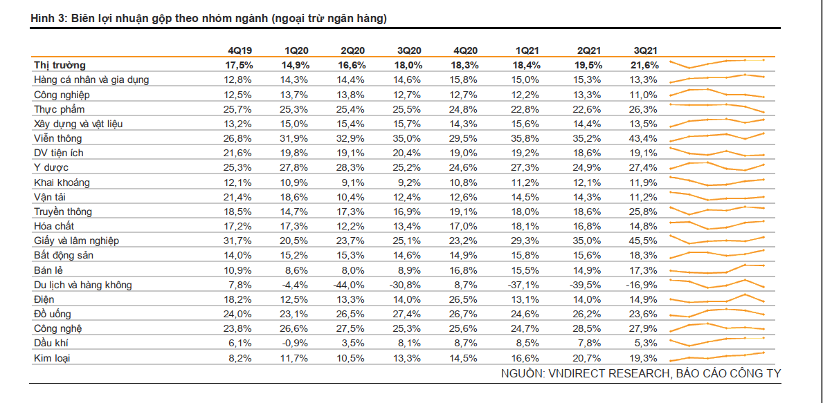 Xu hướng biên lợi nhuận của một số nhóm ngành đang cho thấy chiều hướng tích cực. Ngoại trừ ngân hàng, những ngành cho thấy sự mở rộng biên lợi nhuận gộp trong 3 quý gần nhất là: công nghệ, kim loại, điện, đồ uống, thực phẩm, bán lẻ, viễn thông. Trong bối cảnh hiện tại của nền kinh tế, hàng tiêu dùng như đồ uống, bán lẻ, thực phẩm được kỳ vọng sẽ hồi phục mạnh mẽ trở lại sau đại dịch.