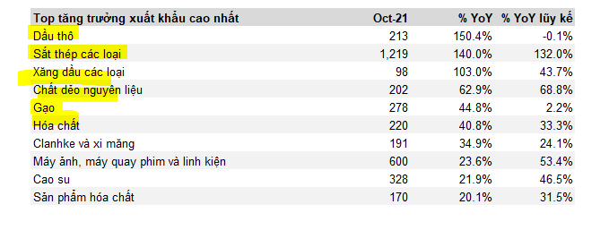 Theo dữ liệu thống kê từ công ty chứng khoán SSI, Top 5 ngành nghề có tốc độ tăng trưởng xuất khẩu cao nhất tính đến 21/10 là dầu, sắt thép, chất dẻo, gạo và hóa chất. Qua số liệu thống kê, chúng ta thấy được các ngành nghề đang được hưởng lợi nhờ vào các cuộc khủng hoảng năng lượng, lương thực và ảnh hưởng của biến đổi khí hậu diễn ra trên toàn cầu.