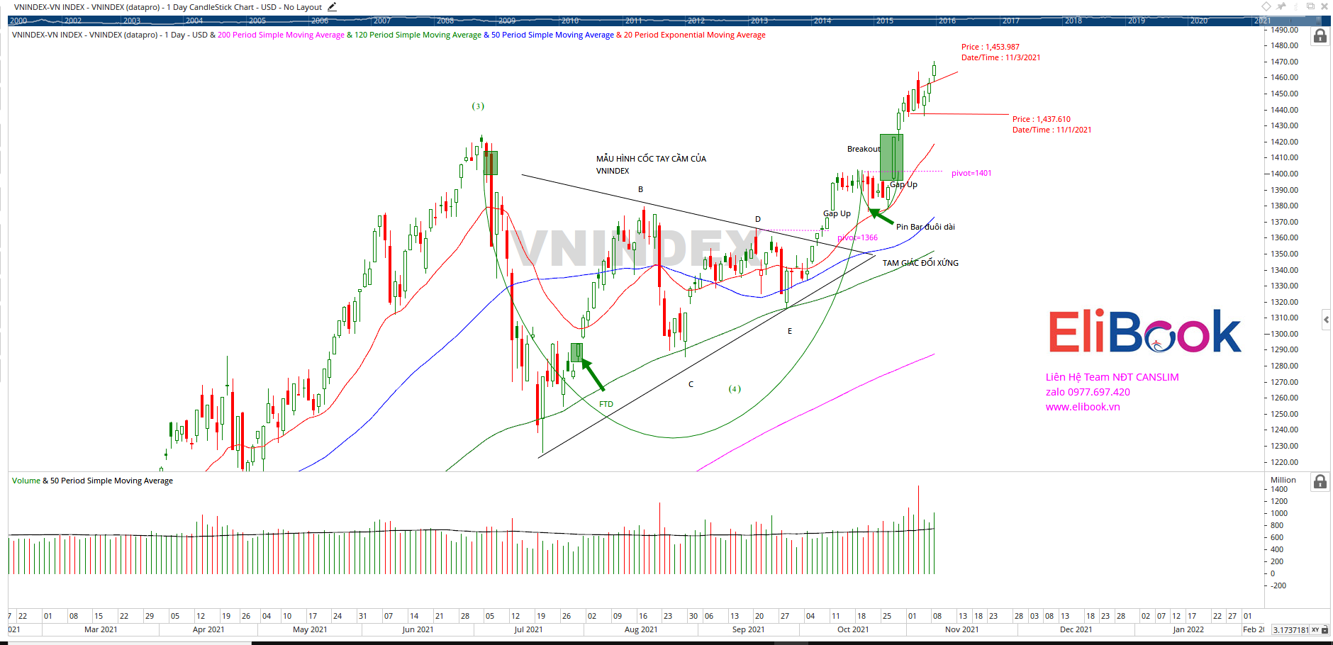 Thị trường hiện tại vẫn đang trong XU HƯỚNG TĂNG ĐƯỢC XÁC NHẬN với 2 phiên phân phối. Phiên giao dịch tỷ USD hàng về tràn ngập trong sắc xanh là minh chứng lớn nhất cho xu hướng Uptrend hiện tại. Mục tiêu giá của mẫu hình Tam giác đối xứng: 1,550 điểm – chính là nơi mà mọi nhà đầu tư đang hướng đến cho mục tiêu hiện tại của chỉ số VN-Index.