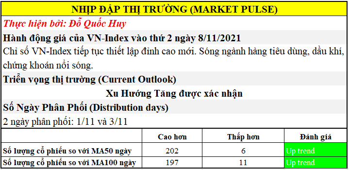 Chỉ số VN-Index có phiên đóng cửa tăng giá thứ 3 liên tiếp với khối lượng giao dịch cao hơn 34% KLGD BQ 50 phiên. Thị trường liên tiếp thiết lập những kỷ lục mới cho riêng mình, đà tăng giá được ủng hộ bởi khối lượng giao dịch tăng dần. Sự xoay tua đổi trụ đến từ nhiều nhóm ngành củng cố niềm tin về đà tăng giá bền vững của thị trường chung.