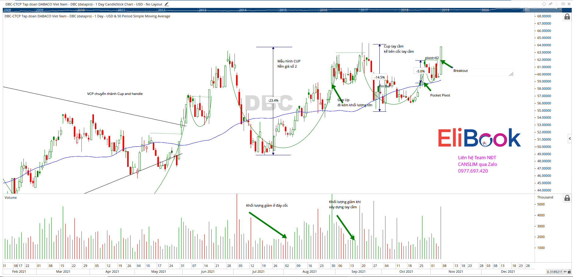 Việc các công ty chứng khoán nâng triển vọng dự phóng lợi nhuận hay giá mục tiêu là một chất xúc tác đối với giá cổ phiếu. Team NĐT Canslim khuyến nghị mua DBC vào ngày 26/10/2021 khi có điểm mua Pocket Pivot và tiếp tục bổ sung vị thế ở ngày 5/11/2021 khi có điểm breakout mẫu hình chiếc cốc-tay cầm.