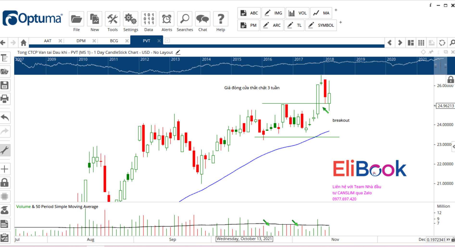 Nhìn vào đồ thị giá, PVT hiện tại đang nằm trong vùng mua hợp lý +5% từ điểm pivot mẫu hình Giá đóng cửa thắt chặt 3 tuần. Điểm pivot: 25. Team NĐT CANSLIM khuyến nghị nhà đầu tư mua vào cổ phiếu PVT tại vùng giá < 26.25. Stoploss -8% từ điểm mua.