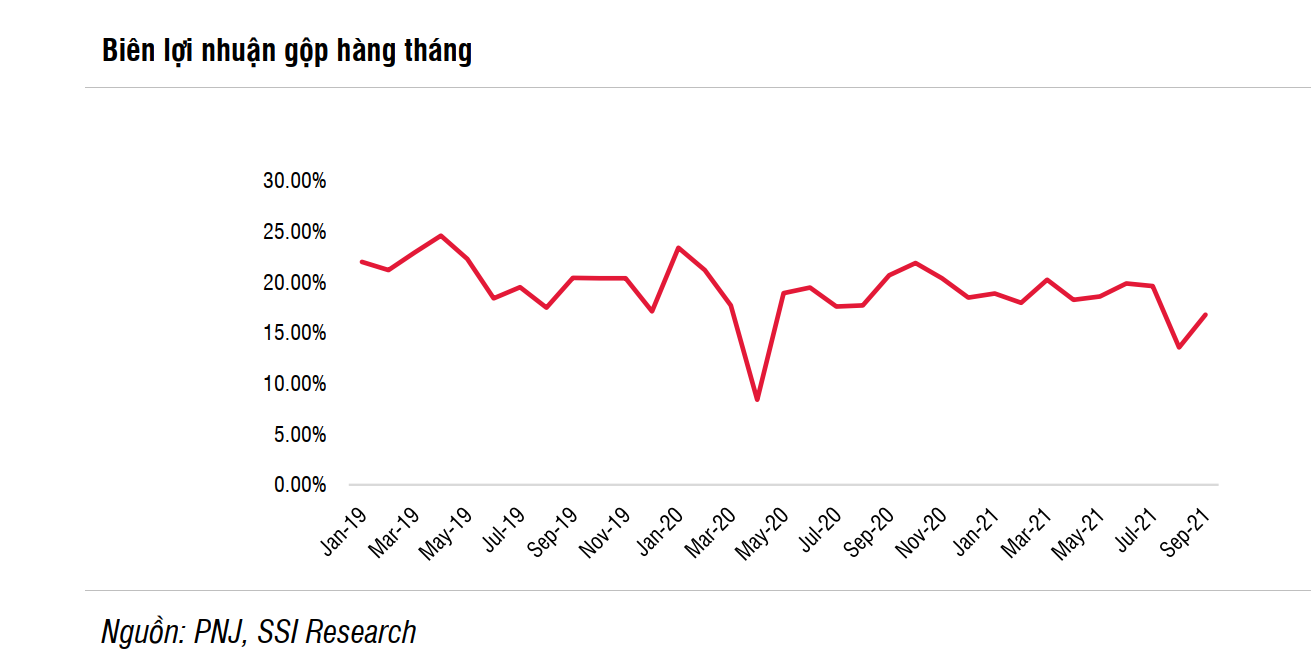 SSI Research cho rằng biên lợi nhuận gộp của PNJ có xu hướng giảm từ năm 2019 nhưng điều này không đáng ngại vì công ty đang trong giai đoạn nổ lực mở rộng thị phần. Đầu tiên, mảng vàng miếng tăng tỷ trọng từ 21% từ tháng 1.2021 lên 26.6% vào tháng 9.2021. Thứ hai, PNJ mở rộng sang các thành phố cấp 2 và cấp 3 nơi có biên lợi nhuận gộp thấp hơn thành phối cấp 1. PNJ ước tính việc chuyển đổi số sẽ giúp biên lợi nhuận gộp được cải thiện trong tương lai. SSI Research dự báo biên lợi nhuận gộp sẽ cải thiện từ 19.4% năm 2021 lên 20.3% trong năm 2022.