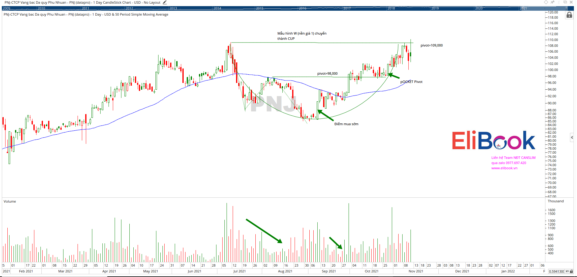 Cổ phiếu PNJ đã được Team NĐT CANSLIM khuyến nghị mua vào ở đầu tháng 9.2021 khi có dấu hiệu tạo đáy và tiếp tục bổ sung vị thế sau khi có điểm breakout vượt qua điểm pivot=98,000 của mẫu hình Hai Đáy (W). Mẫu hình W giờ đây được chuyển thành mẫu hình Chiếc Cốc. Đây là nền giá số 1 đối với PNJ.