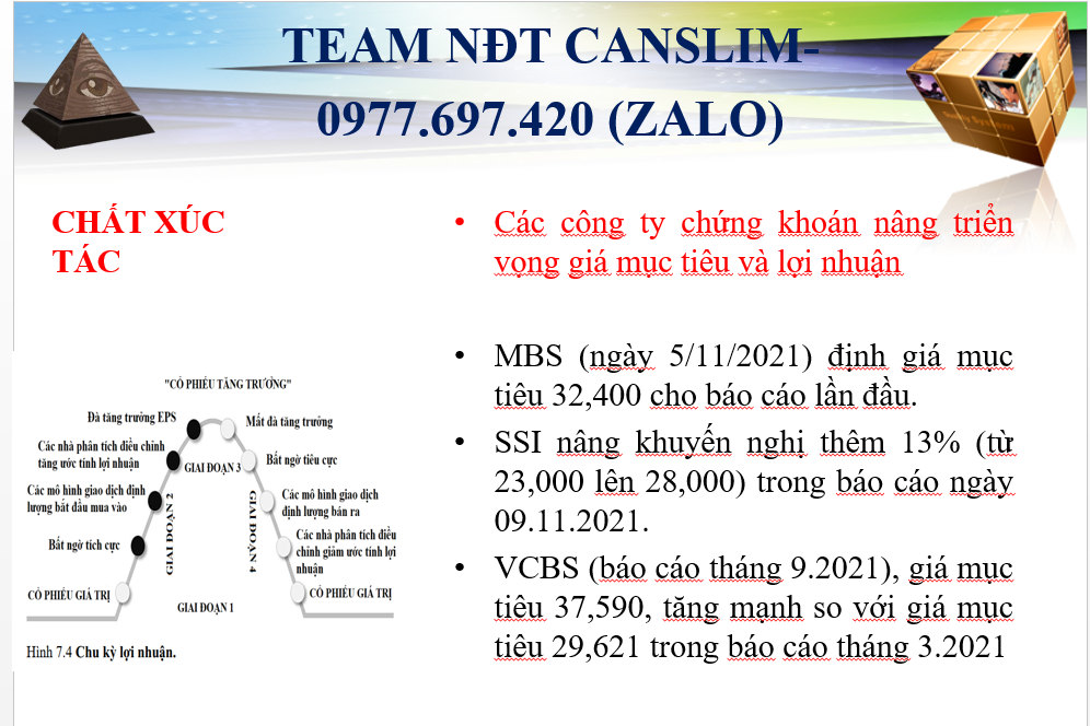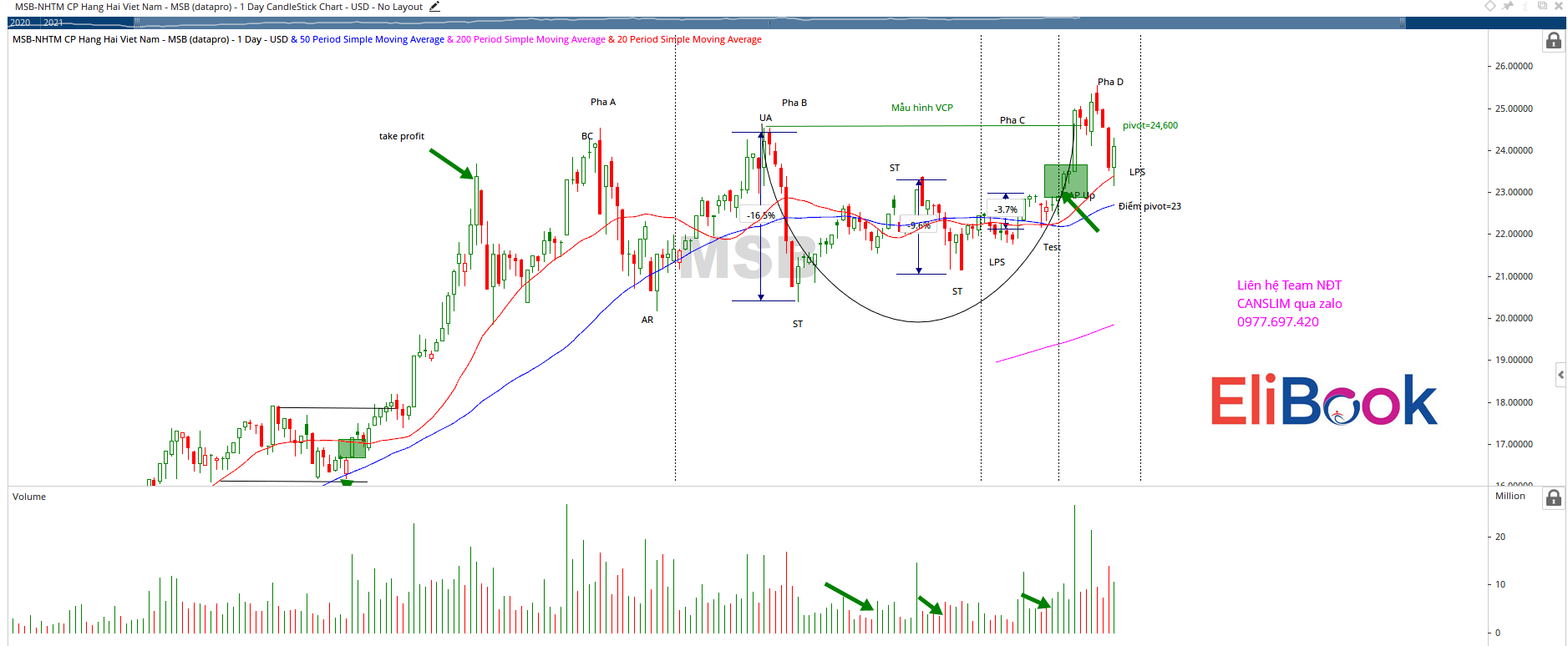 Điểm mua trở lại của Team NĐT CANSLIM vào ngày 1/11/2021 khi có điểm Gap Up trùng với breakout mẫu hình VCP (độ biến động thu hẹp) qua ba vòng là -17%; -10% và -4%. Sau đó, vào ngày 3.11.2021, MSB tiếp tục có điểm breakout (phá vỡ) vượt qua điểm mua pivot của mẫu hình Chiếc Cốc là 24,600.