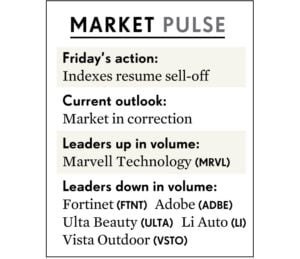 Nhật Báo IBD hạ tiếp triển vọng thị trường xuống đèn đỏ, tức “Market In Correction” (Thị trường ở trong xu hướng giảm). Điều này yêu cầu nhà đầu tư tránh mua cổ phiếu mới và thực hiện hiện thực hóa lợi nhuận để giảm sự hiện diện rủi ro trên thị trường. Tín hiệu bán trở nên cực kỳ quan trọng.