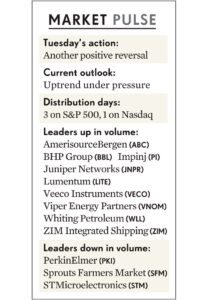 Vào thời điểm này, thị trường chưa rõ ràng rằng các nhà quản lý quỹ đổ tiền vào nên triển vọng hộp Nhịp Đập Thị Trường của Nhật Báo IBD vẫn tiếp tục là “uptrend under Pressure”