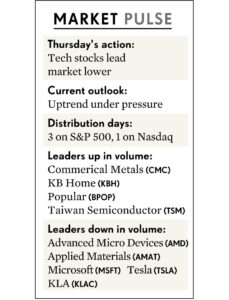 Với triển vọng “Uptrend Under Pressure (Xu Hướng Tăng Có Thể Bị Thay Đổi), nhà đầu tư tăng trưởng cần phải thực hiện vị thế phòng thủ. Khối lượng sụt giảm giúp tránh tăng thêm ngày phân phối. Mặc dù lĩnh vực năng lượng và tài chính vẫn đang tăng giá khá tốt từ điểm mua gần đây, nhưng các cổ phiếu công nghiệp tiếp tục suy yếu.