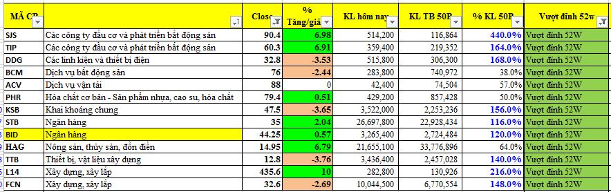 Danh sách cổ phiếu vượt đỉnh 52 tuần vẫn chưa có sự cải thiện, tiếp tục sụt giảm xuống còn 13 cổ phiếu vượt đỉnh. Không còn quá nhiều cổ phiếu vượt đỉnh như Uptrend vào đầu tháng 10 với danh sách lên tới 40-50 mã cổ phiếu/mỗi ngày vượt đỉnh 52 tuần. Đa phần các cổ phiếu nằm trong danh sách đỉnh 52 tuần đã tăng giá kéo dài, rời xa các điểm pivot của các nền giá. Không còn quá nhiều cổ phiếu có nền giá chặt chẽ và đáp ứng các yếu tố cơ bản tốt tham gia vào danh sách vượt đỉnh cho thấy sự suy yếu của thị trường chung.