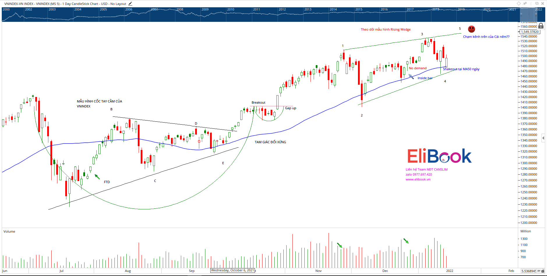 Chỉ số VN-Index mở cửa với Gap down giảm giá về vùng MA50 ngày nhưng sau đó nhanh chóng hồi phục và đóng cửa ở mức giá gần cao nhất phiên. Khối lượng giao dịch ở mức thấp cho thấy không có quá nhiều lực cung xuất hiện, đơn thuần chỉ là cú kiểm tra trở lại sau cú Shakeout tại MA50 ngày của chỉ số VN-Index.