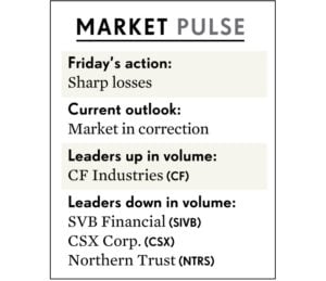 Chỉ số SP500 giảm 1.9% và đóng cửa dưới MA200 ngày lần đầu tiên từ tháng 6 năm 2020. CF Industries (CF) là cổ phiếu tăng mạnh nhất trong chỉ số này, với mức tăng 2.6%. Đồ thị cổ phiếu này đang hình thành Nền Giá Dốc Lên (Ascending base).