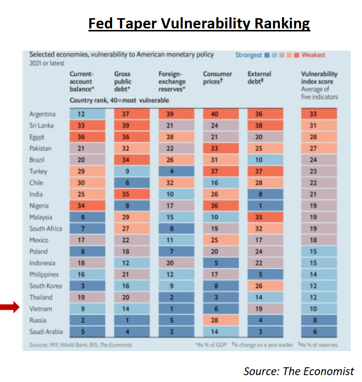 Việt Nam ở vị thế mạnh hơn với 100 tỷ đôla trong quỹ dự trữ ngoại hối, và cao hơn ngưỡng 10% của IMF. Nợ nước ngoài của Việt Nam thấp hơn 40% GDP, trong đđó hơn một nửa là các khoản vay mềm bởi các tổ chức tài chính lớn như World Bank. Do đó, Vina Capital đánh giá nợ của Việt Nam không bị tổn thương nhiều nếu chính sách tiền tệ thế giới thắt chặt.