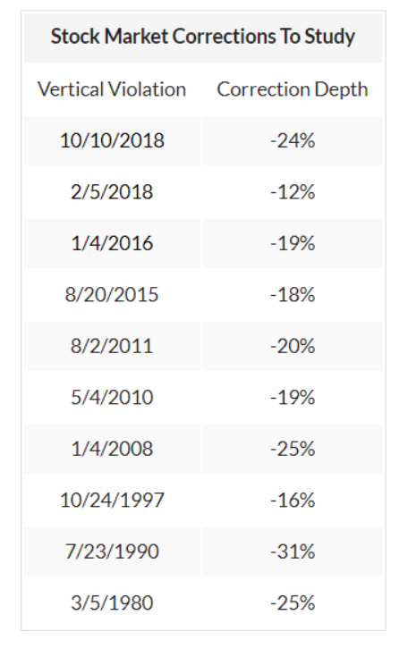 Bảng trên cho 10 trường hợp vi phạm dọc trong quá khứ của chỉ số Nasdaq. Một vài vi phạm dọc dẫn tới thị trường con gấu. Một số khác là sự điều chỉnh khá nông nhưng phải mất kha khá thời gian trước khi bắt đầu hồi phục.