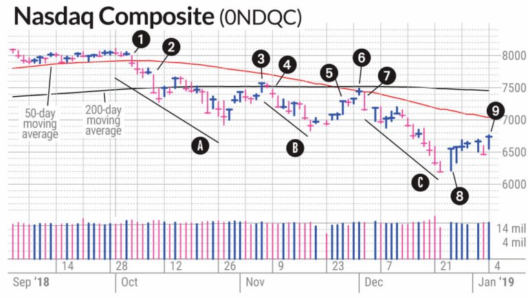 Hãy lấy ví dụ thị trường gấu từ quý 4 năm 2018. Giá phá thủng đường MA50 ngày một cách không bình thường (điểm số 1). Với mức giảm 1.8% từ ngày 4 tháng 10, nó giảm mạnh hơn so với những ngày gần đó. Trước đó, chỉ số Nasdaq gần như đi ngang. Điều này đủ để Nhật Báo IBD chuyển trạng thái triển vọng thị trường sang đèn vàng, tức “uptrend under pressure (xu hướng tăng có thể bị thay đổi).