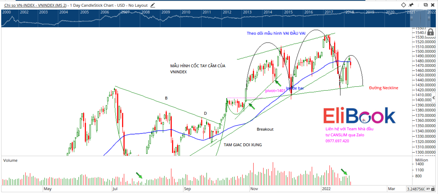 Mẫu hình Vai đầu vai đang ngày càng xuất hiện rõ ràng hơn trên chỉ số VN-Index với phần Vai phải đang dần lộ diện. Khối lượng giao dịch thấp tại phần Vai phải cho thấy lực mua đã bắt đầu cạn kiệt và VN-Index không thể đẩy giá vượt qua đỉnh trước đó. Đường Neckline (đường viền cổ) trở thành đường kích hoạt điểm nổ (Sell Signal) nếu chỉ số VN-Index giảm điểm phá thủng đáy 1424.36.