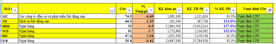 Danh sách vượt đỉnh 52 tuần vẫn chưa có sự thay đổi nhiều, chỉ vọn vẹn 6 cổ phiếu xuất hiện trong danh sách này. Ngân hàng và bất động sản KCN đang là những ngành tiềm năng trở thành Leader trong con sóng tăng giá sắp tới. Chỉ số RS ngành ngân hàng đang được cải thiện khá tốt trong thời gian gần đây khi có nhiều cổ phiếu thuộc nhóm ngành này liên tục thiết lập đỉnh 52 tuần.